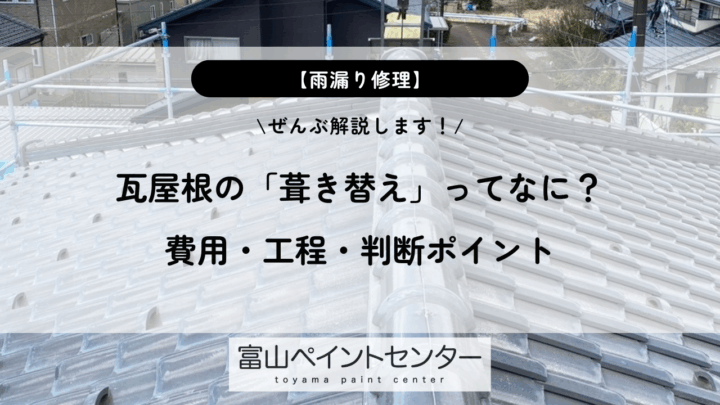 【雨漏り修理】瓦屋根の「葺き替え」ってなに?費用・工程・判断ポイントをぜんぶ解説します! こんにちは!富山市の外壁塗装・屋根工事・雨漏り専門店、富山ペイントセンターです!いつもブログを読んでくださってありがとうございます ☔✨ 最近、天井のシミに気づいたり、台風のあとに「ん?軒下から水がポタポタ…?」なんて経験、ありませんか?「もしかして、これって雨漏り…?」「瓦がズレてるかも…?」とドキッとしたあなた。実はその“ちょっとした異変”、放っておくと大変なことになるかもしれません。 特に築年数が経った瓦屋根のおうちでは、いつ雨漏りが起きてもおかしくない状態のケースが少なくないんです。 そこで今回は、そんな雨漏りの根本的な解決策として注目される「瓦屋根の葺き替え」について、✅ 費用の目安✅ 工事の流れ✅ 「もう補修じゃ無理かも…?」と判断すべきサインを、富山市の専門店目線でわかりやすく解説します! 瓦屋根の雨漏り、放置はぜったいNG! 瓦屋根は見た目も美しく耐久性も抜群…なのですが、メンテナンスを怠ると雨漏りリスクが一気に上がります。 「瓦が割れた」と思っても、実は原因はその下にある防水シート(ルーフィング)の劣化だった、なんてこともよくあります。瓦は“雨を流す”ための役割であって、“止める”ためのものではないんですね。 そして、防水シートの寿命はおよそ20〜30年。経年劣化や台風・積雪によって破れてしまうと、建物の内部に雨水が侵入し、柱や梁を腐らせる原因になります。 さらに怖いのが、湿気を好むシロアリ被害やカビによる健康被害。「まだ大丈夫かな…?」と油断せず、早めの点検がカギです 「葺き替え」ってなに?他の修理との違いをサクッと解説! 瓦屋根の修理にはいくつか方法がありますが、「葺き替え」はその中でも屋根をまるごとリニューアルする大掛かりな工事です。 つまり、 古い瓦 → 撤去もしくは再利用して積み直し防水シート&下地板 → すべて新品に! という感じで、屋根をゼロから作り直します。だからこそ費用は高くなりますが、耐久性・防水性が劇的にアップします。 ちなみに「瓦の差し替え」や「漆喰補修」は“部分的な修理”。軽度のトラブルならOKですが、下地ごと傷んでいる場合は根本解決にならないことも。 「葺き替え」が必要なサイン、出てませんか? 次のうち、いくつか当てはまる方は要注意です 築40年以上、屋根のメンテナンス歴がない 雨漏りが2箇所以上で起きている 野地板(下地)が腐っていると言われた 修理したのに、また雨漏りした これ、どれか一つでも該当するなら、葺き替えのタイミングかもしれません。 費用はいくら?──富山エリアの相場をチェック! 瓦屋根の葺き替え費用は、1㎡あたり15,000円〜25,000円前後。40坪(約132㎡)の一般的な住宅なら、200万〜350万円ほどが目安です。 費用の内訳は主にこの3つ1️⃣ 瓦などの材料費2️⃣ 下地の補修費3️⃣ 足場代 そして、選ぶ瓦の種類によっても価格が変わります。日本瓦は高価で重厚感がありますが、最近は軽量瓦やガルバリウム鋼板が人気。軽くて地震にも強く、コスパも◎。 さらに、火災保険の「風災補償」や富山市のリフォーム助成金を利用すれば、負担をぐっと抑えられるケースもあります。 工事の流れ:だいたい5〜10日で完了! 1️⃣ 足場の設置&養生2️⃣ 古い瓦の撤去3️⃣ 野地板の補修・交換4️⃣ 防水シート(ルーフィング)の新設5️⃣ 新しい瓦の設置6️⃣ 棟部分の仕上げ&清掃 富山ペイントセンターでは、天候に応じて丁寧に二重養生を行い、作業エリアを小分けに進める「区画施工」で、工事中の雨漏りリスクを徹底的に防ぎます ☔ 業者選びで失敗しないための3ポイント! 1️⃣ 建設業許可証を持っているか2️⃣ 富山での施工実績が豊富か3️⃣ 施工後の保証があるか 特に「見積もり書」は要チェック!「一式」とだけ書かれたざっくり見積もりは要注意。信頼できる業者は、㎡単価・枚数・単価まできっちり明記しています。 まとめ:瓦屋根の雨漏りは“根本対策”で安心を 瓦屋根の葺き替えは費用こそかかりますが、それ以上に「家を守る」「資産を守る」という価値があります。 部分補修で何度も直すより、一度の葺き替えで長持ちさせる方が結果的におトクなことも多いんです。 富山市で外壁塗装・屋根工事・雨漏り修理をお考えの方は、ぜひお気軽にご相談ください!富山ペイントセンターがあなたの家を、次の10年も安心にします。 私たちは、富山市を中心とした 地域密着で建物を長持ちさせる施工メーカー 昭和50年に創業し、地域の皆さまから選ばれ続けてきました。 外壁・屋根塗装や雨漏り工事で建物を長持ちさせ、 「10年後、20年後の塗装も 富山ペイントセンターに依頼したい!」 これからもそう思っていただけるよう、 私たちは外壁塗装、屋根塗装・雨漏り工事の技術力・品質を磨きます。 そして、皆さまが笑顔で喜んでいただける 外壁塗装、屋根塗装・雨漏り工事専門店にしていきた