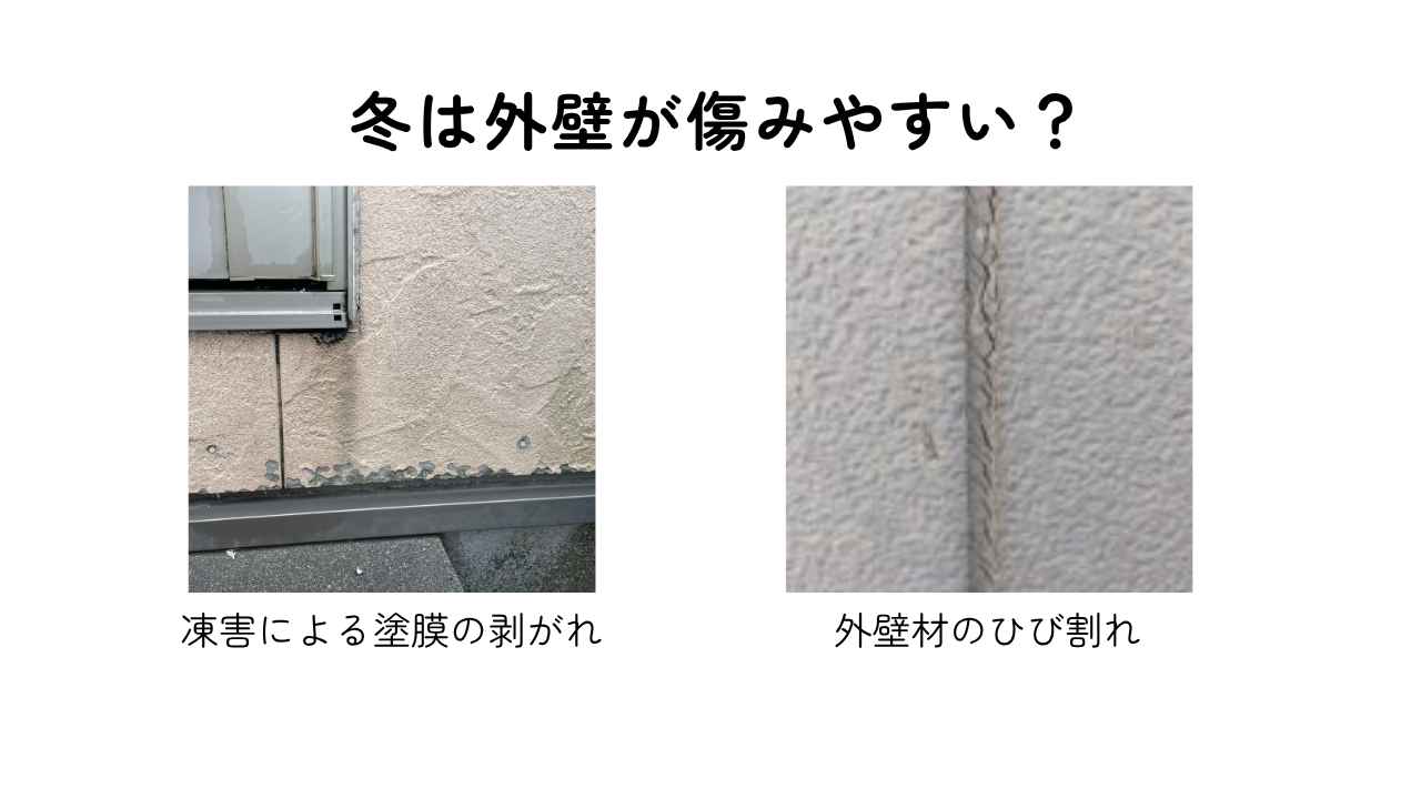 小さなひび割れや塗膜の浮きも、冬の寒さで水分が凍って膨張→塗膜剥がれやヒビ拡大…なんてことが起こるんです。