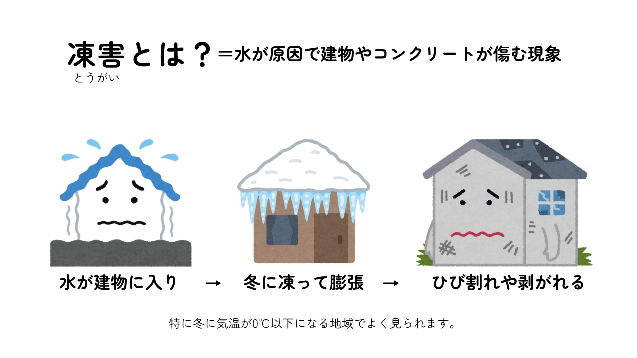 特にモルタルやALCパネルは水分を吸いやすいため、凍害リスクが高めです。