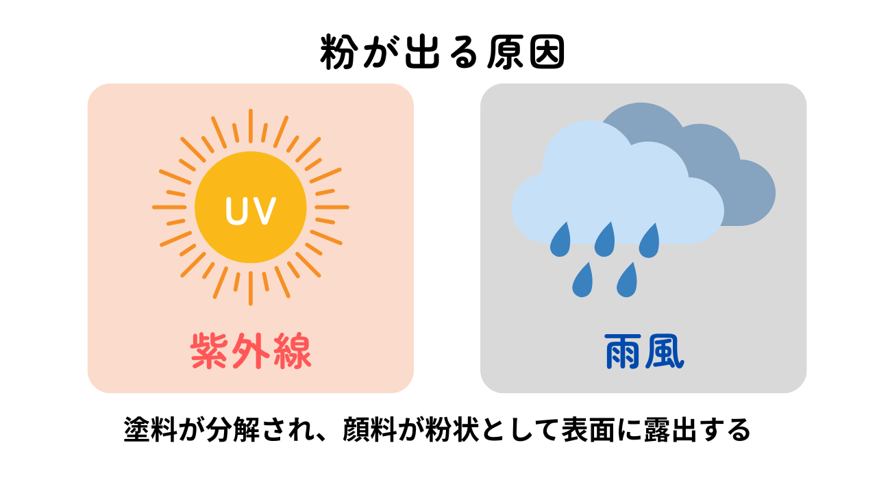 塗膜が紫外線で分解 → 粉になる → 手に白くつく