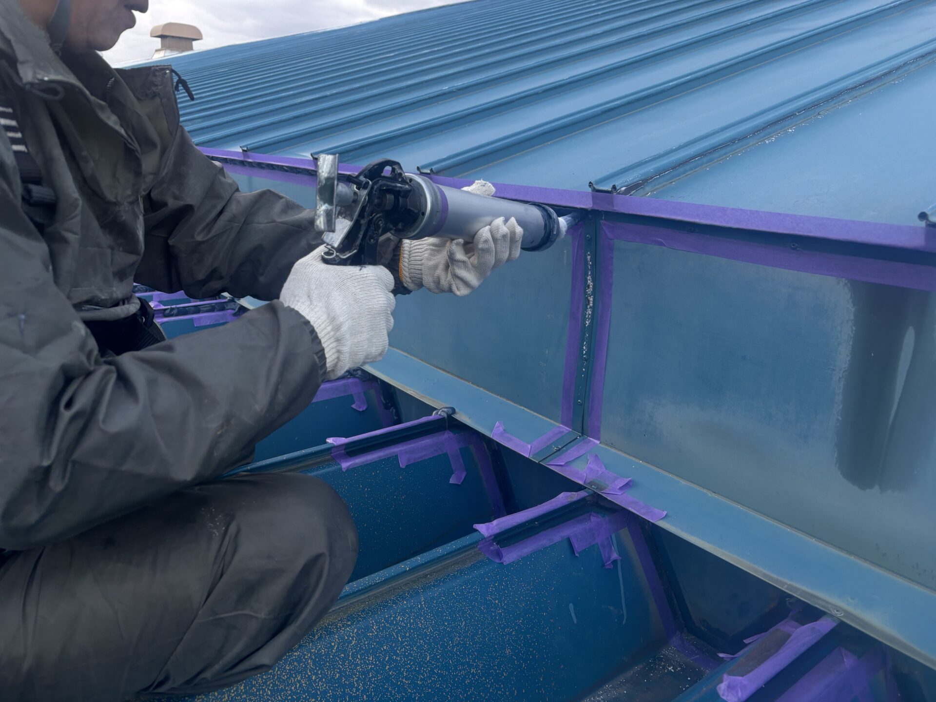 下地処理後、板金屋根の継ぎ目部分に専用のシーリング材を充填していきます。隙間を逃さず、均一な厚みになるよう職人が手作業で施工し、雨水の侵入口を確実に塞ぎます。