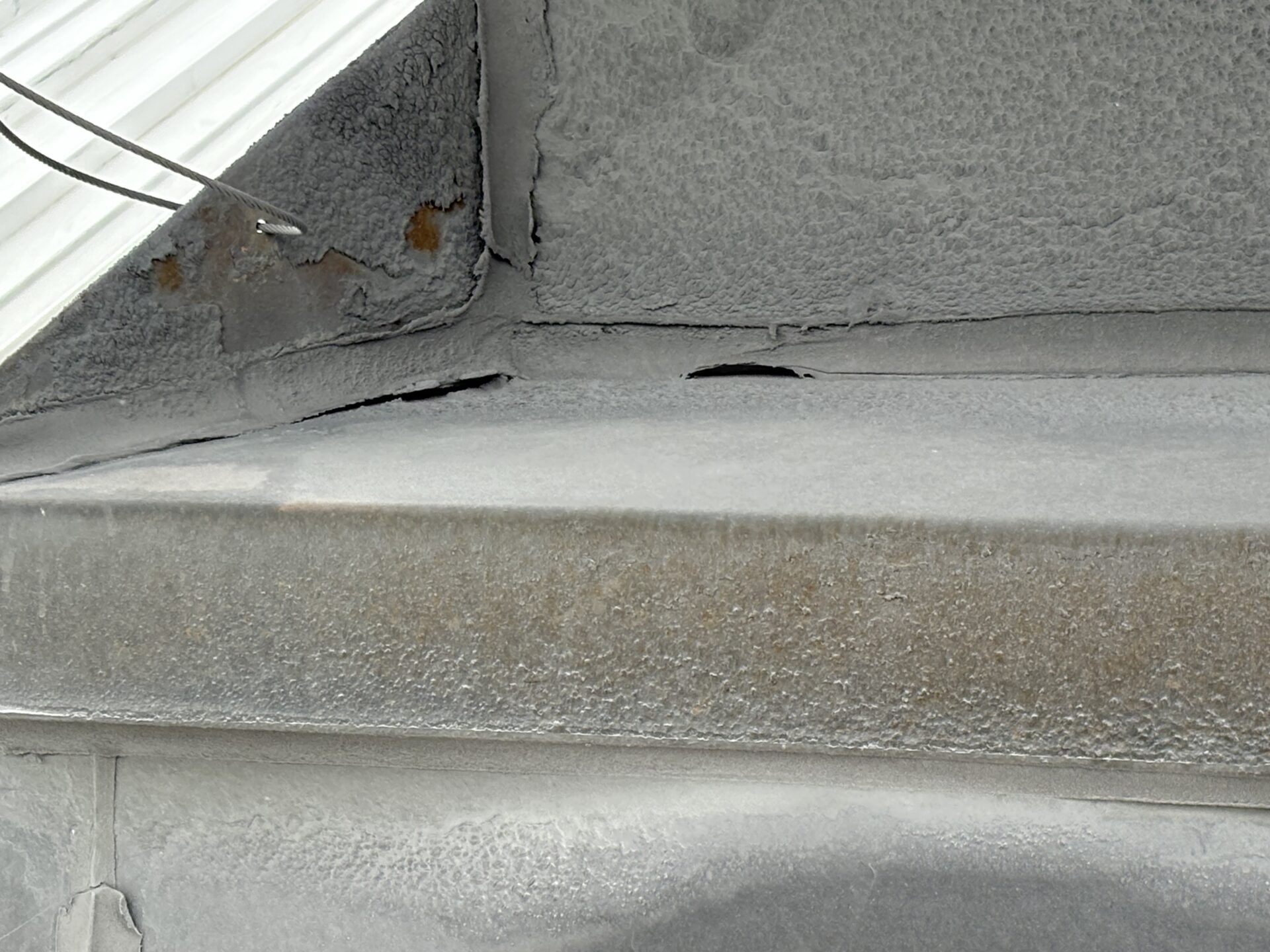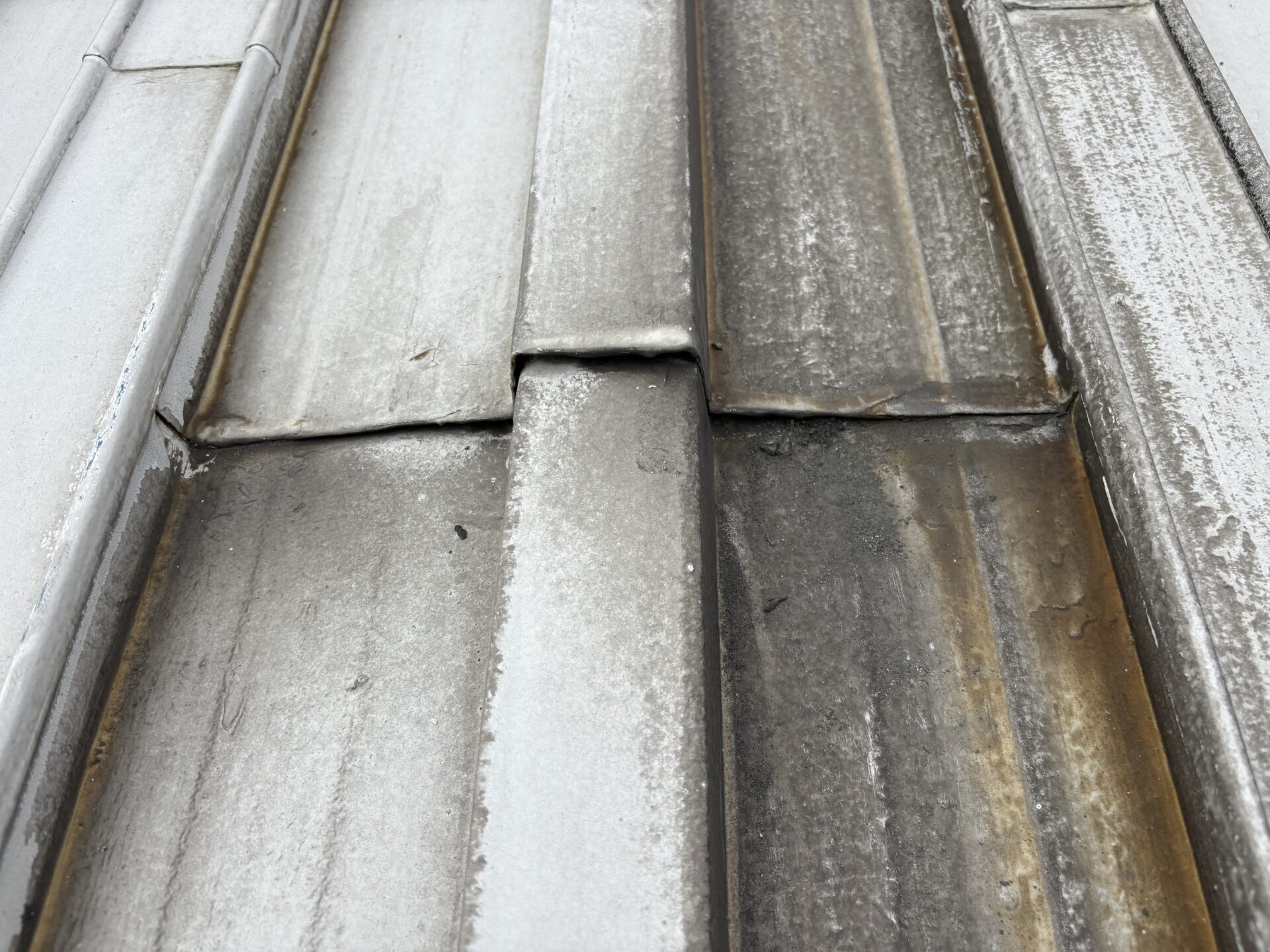 現地調査を行った結果、板金屋根の継ぎ目部分に施工されていた既存のシーリングが劣化し、隙間が生じていることが確認できました。