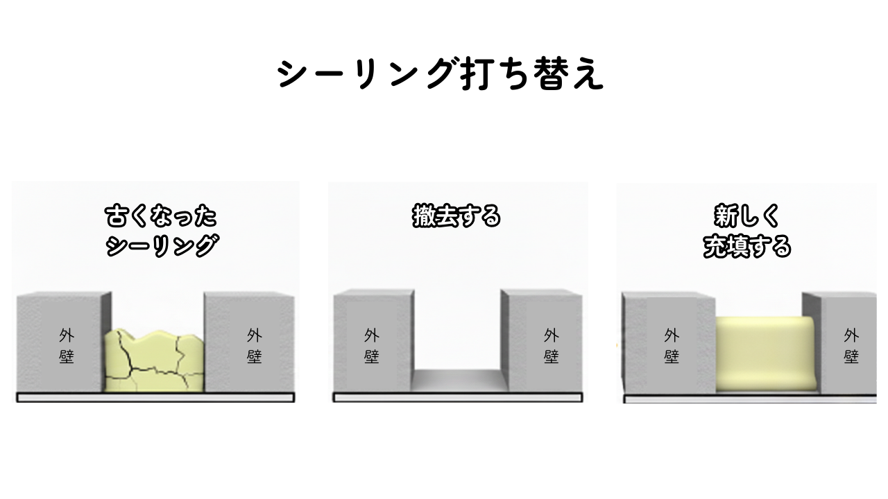 シーリング打ち替えは、既存のシーリング材を完全に撤去して新しい材料を充填する工法です。