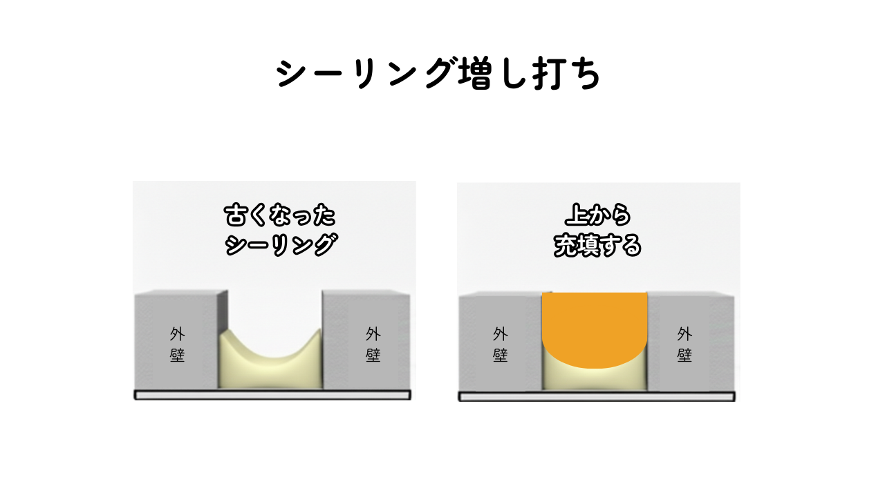 シーリング増し打ちは、既存のシーリング材の上から新しい材料を重ねる工法です。