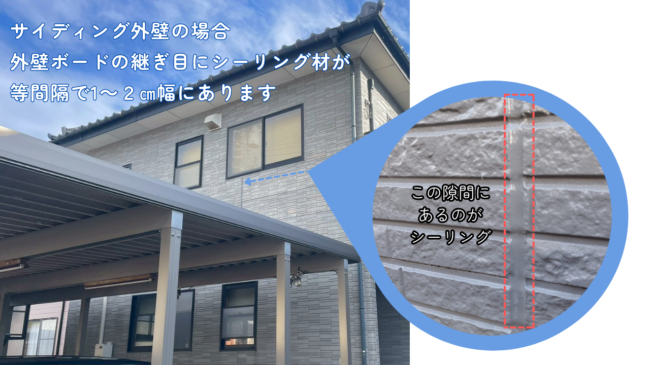 サイディング外壁の建物では、外壁ボードの継ぎ目にシーリング材が充填されています。シーリング材はゴムのような弾力で建物の動きを吸収します。紫外線や雨風の影響で、シーリング材は約10年前後で劣化します。
