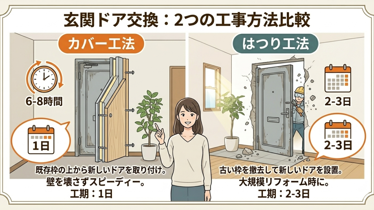 カバー工法は既存の枠の上から新しい枠を取り付ける工事です。はつり工法は壁を一部壊して玄関ドアを交換する工事です。