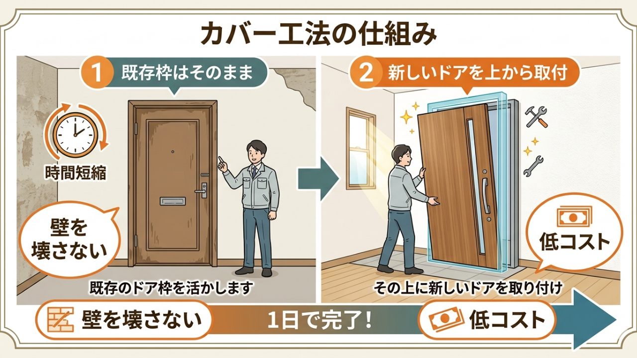 カバー工法は既存の玄関ドア枠の上に新しい枠を取り付ける工事です。壁を壊す必要がないため工期が短く費用も抑えられます。