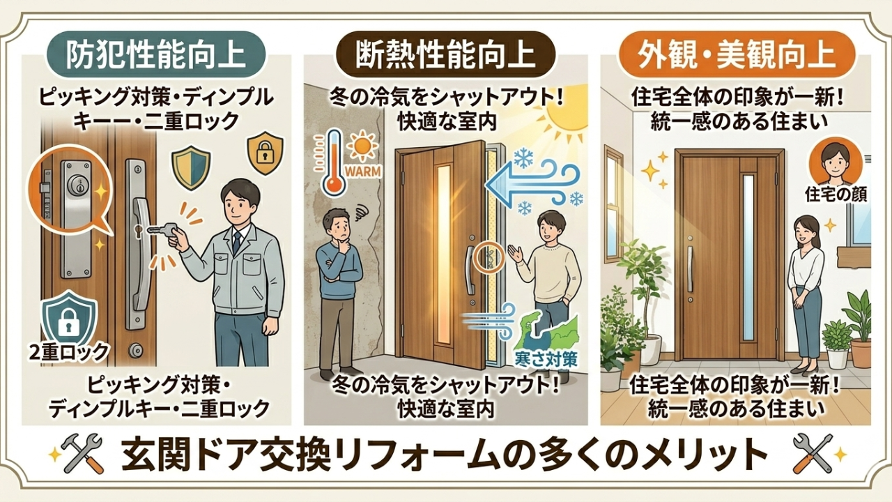 玄関ドア交換リフォームには多くのメリットがあります。