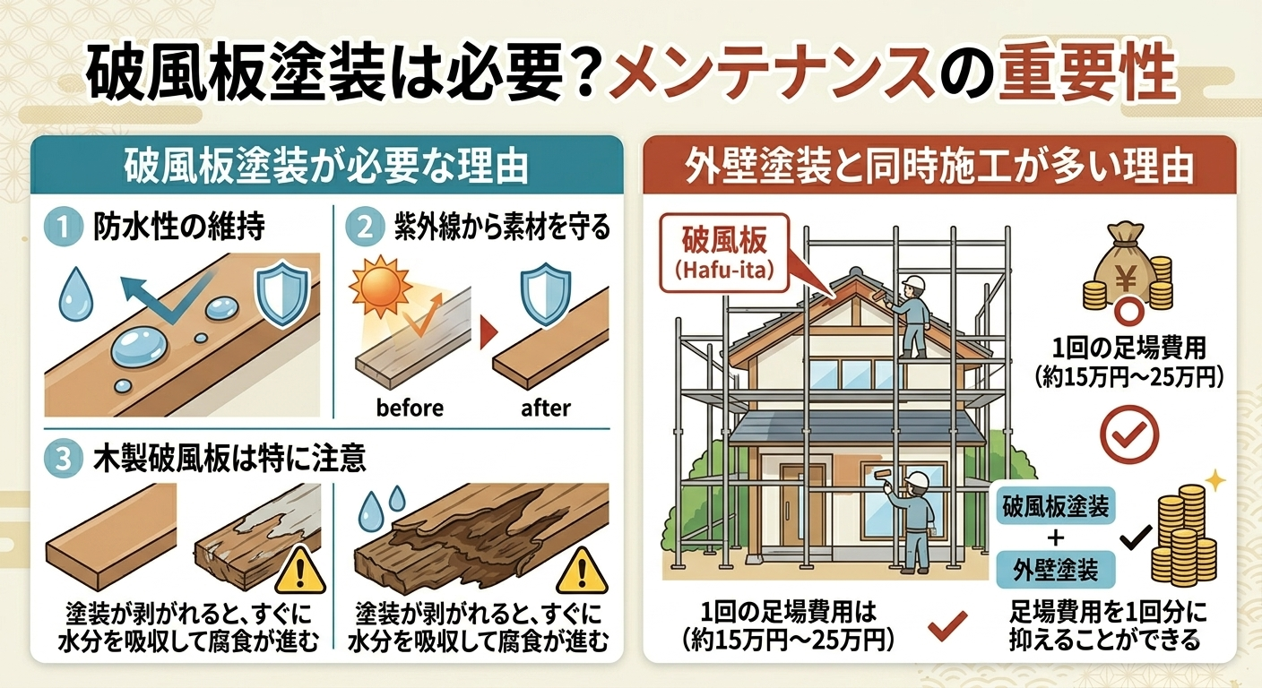 この記事を読むことで、破風板塗装の必要性や適切なタイミングが分かり、後悔しないメンテナンス判断ができるようになります。