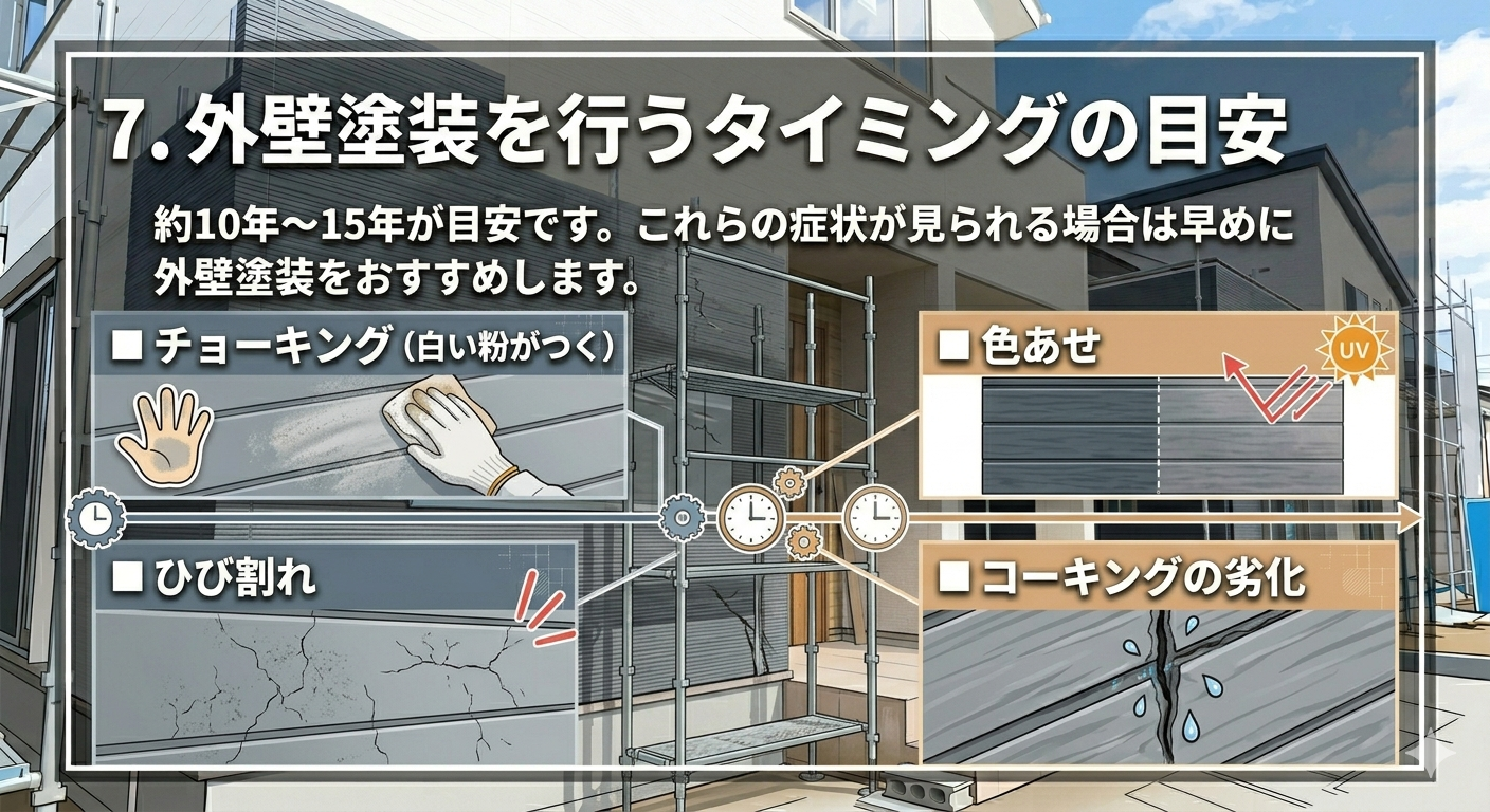 外壁塗装のタイミングは約10年〜15年が目安です。