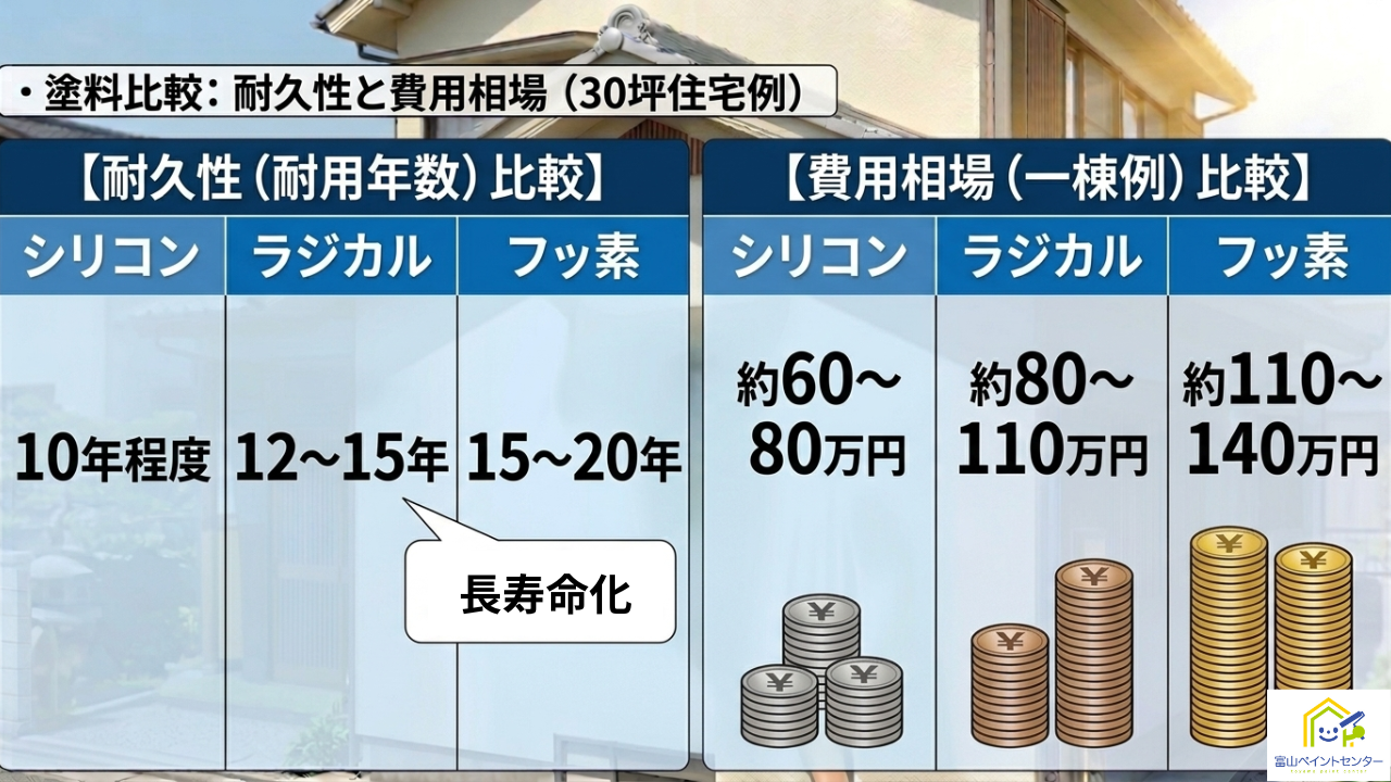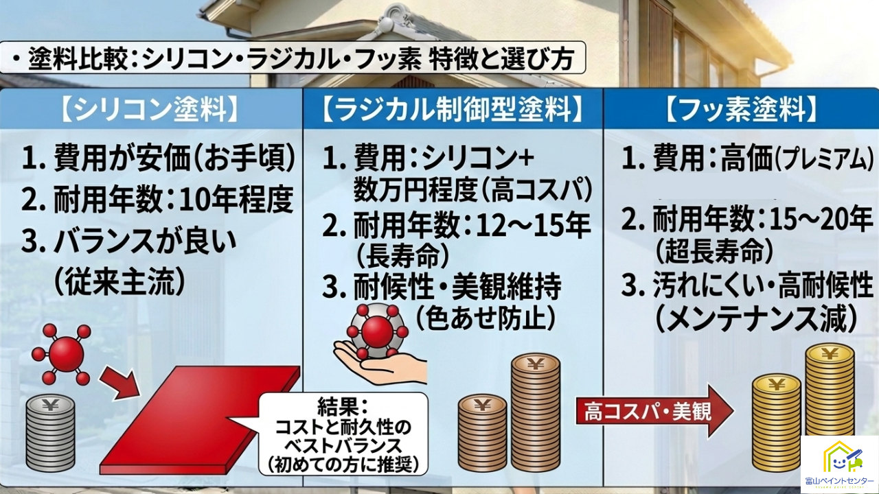 ラジカル塗料は「価格と耐久性の中間」に位置し、最もバランスが良い塗料です。