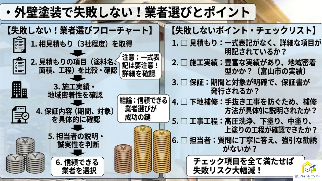 外壁塗装で失敗しないためには、塗料だけでなく業者選びが重要です。