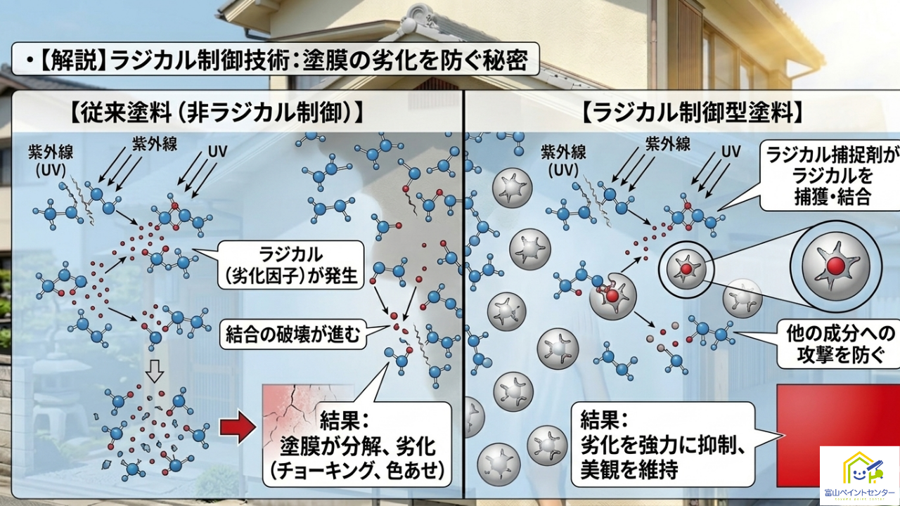 このラジカルが塗膜を破壊し、ひび割れや色あせにつながります。