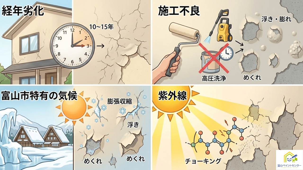 外壁塗装の塗膜剥がれには複数の原因があります。