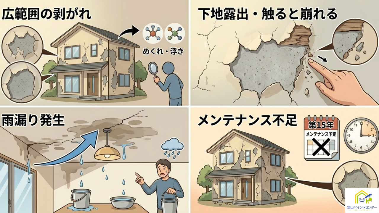 外壁塗装の塗膜剥がれを放置するとリスクが大きくなります。