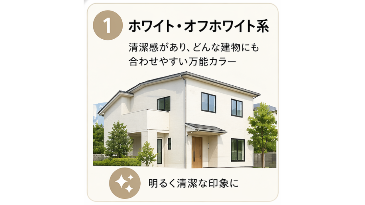 清潔感があり、どんなデザインの建物にも合わせやすい万能カラーです。一戸建てでも集合住宅でも根強い人気を誇り、街並みに馴染みながら明るい印象を与えます。ただし汚れが目立ちやすいため、防汚性能の高い塗料との組み合わせがおすすめです。