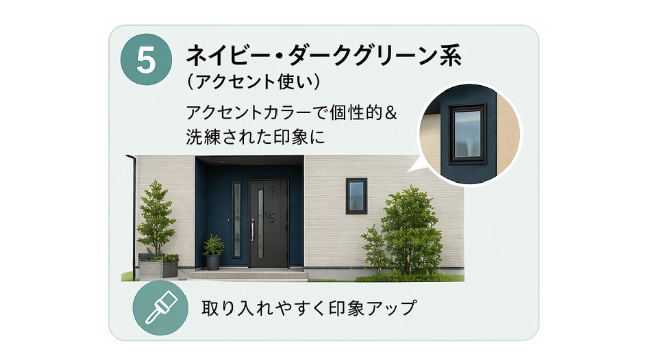 全面に使うのはハードルが高い色ですが、玄関まわりや窓枠などに部分的に取り入れることで、個性的で洗練された印象になります。他の色との組み合わせで表情が大きく変わるため、プロに相談しながら取り入れるのがおすすめです。