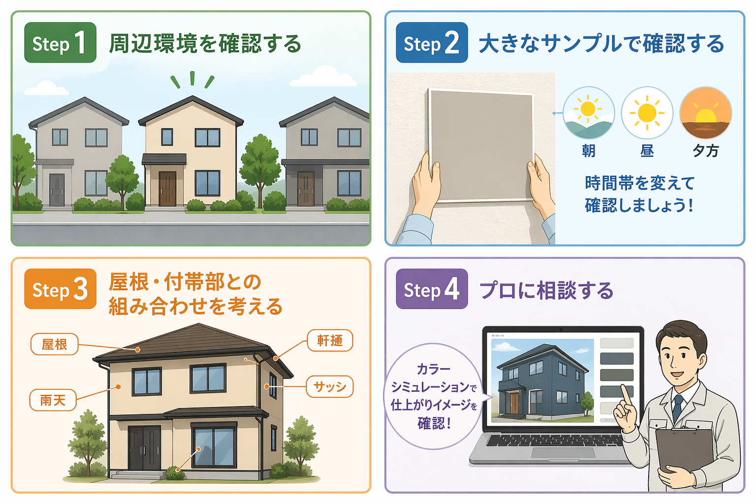 外壁の色だけを単独で考えるのではなく、屋根・雨樋・軒天・サッシなどとのトータルバランスを確認することが重要です。