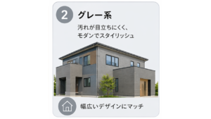 近年、特に選ばれる機会が増えているのがグレー系です。モダンでスタイリッシュな外観になるだけでなく、汚れが目立ちにくいという実用面でも高く評価いただいています。淡いライトグレーから濃いチャコールグレーまでバリエーションが豊富で、屋根や付帯部との色合わせも取りやすいのが特徴です。
