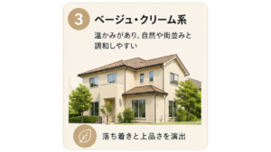 ベージュ系は、温かみがありながら落ち着いた印象で、和風・洋風を問わず幅広い建物に馴染みます。「主張しすぎず、でも古くならない」という点が長年にわたって支持されている理由です。経年による色あせも比較的目立ちにくく、次の塗り替えまで美観を保ちやすいというメリットもあります。