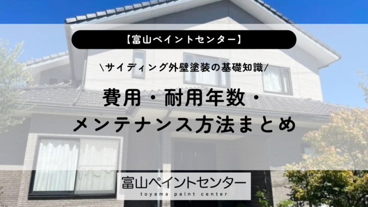 サイディング外壁塗装の基礎知識|費用・耐用年数・メンテナンス方法まとめ こんにちは。富山市の外壁塗装・屋根工事・雨漏り専門店、富山ペイントセンターです!!いつもブログをお読みいただき、ありがとうございます。 富山市で外壁塗装を検討している方の中には、「サイディング外壁塗装の費用はいくらかかるのか」「サイディング外壁塗装のタイミングはいつが良いのか」と悩んでいる方が多くいらっしゃいます。富山市は積雪と湿気が多い地域です。富山市の住宅はサイディング外壁塗装の劣化が進みやすい環境です。 この記事では、サイディング外壁塗装の基礎知識から費用相場、耐用年数、施工工程、業者選びまでを詳しく解説します。この記事を読むと、サイディング外壁塗装の全体像と適切な判断基準が分かります。 富山市で外壁塗装や屋根工事を検討している方はぜひ最後まで読んでみてください。 この記事を書いた人 中陳 武(ナカゼ タケシ) 富山ペイントセンター代表。外壁塗装・防水・雨漏り一筋30年以上の現場派社長です。防水施工技能士1級・雨漏り診断士として、富山の雪・湿気・寒暖差に本気で向き合ってきました。売るためより、“あとで後悔しない工事”を大切にしています。 目次 サイディング外壁塗装とは?基礎知識をわかりやすく解説 サイディング外壁塗装が必要な劣化サイン サイディング外壁塗装の最適なタイミングと耐用年数 サイディング外壁塗装の費用相場【富山市版】 サイディング外壁塗装の施工工程 業者選びで失敗しないためのチェックポイント 外壁塗装と雨漏り対策の関係性 よくある質問(FAQ) まとめ|サイディング外壁塗装で住まいを長持ちさせる 1. サイディング外壁塗装とは?基礎知識をわかりやすく解説 サイディング外壁塗装は、サイディング材の防水性と美観を維持するために行う工事です。外壁塗装は住宅の寿命を延ばす重要なメンテナンスです。 サイディング外壁の種類(窯業系・金属系・木質系・樹脂系) 窯業系サイディングは日本の住宅の約70%に使用されています。窯業系サイディングは10年ごとのサイディング外壁塗装が必要です。 金属系サイディングは軽量で耐久性が高い素材です。金属系サイディングはサビ対策が重要です。 木質系サイディングは防水塗装が不可欠です。 樹脂系サイディングは耐水性が高い素材です。 なぜ塗装メンテナンスが必要なのか サイディング外壁塗装が必要な理由は防水機能の回復です。塗膜の耐用年数は約10年から15年です。塗膜が劣化すると雨水が浸入します。 富山市で築14年の住宅を点検した経験があります。外壁塗装を実施していない住宅はコーキングが硬化していました。サイディング外壁塗装を実施した結果、雨漏りを未然に防ぐことができました。 富山市の気候が外壁に与える影響 富山市は年間降水日数が約180日です。富山市は積雪量が多い地域です。サイディング外壁塗装は寒暖差による膨張収縮から外壁を守ります。富山市で外壁塗装を行う場合は耐候性の高い塗料が重要です。 富山ペイントセンターの外壁塗装について詳しく見てみる 2. サイディング外壁塗装が必要な劣化サイン サイディング外壁塗装が必要なサインを把握することが大切です。 チョーキング現象(白い粉) チョーキング現象は塗膜の劣化です。外壁を触ると白い粉が付着します。チョーキング現象が発生したら外壁サイディング塗装の目安です。 ひび割れ・反り・浮き ひび割れ幅が0.3ミリ以上になると補修が必要です。反りや浮きは雨水浸入の原因です。 コーキング(シーリング)の劣化 コーキングの耐用年数は約7年から10年です。コーキングのひび割れはサイディング外壁塗装と同時施工が効果的です。 カビ・苔・藻の発生 北面の外壁は湿気がこもります。カビや苔は防水性低下のサインです。 放置すると起こる雨漏りリスク サイディング外壁塗装を放置すると下地が腐食します。下地交換は100万円以上になる場合があります。 3. サイディング外壁塗装の最適なタイミングと耐用年数 サイディング外壁塗装は適切な時期が重要です。 塗り替え目安は築何年? 築10年が最初の目安です。築15年を超えると劣化が進行します。 塗料ごとの耐用年数(シリコン・フッ素・無機) シリコン塗料は耐用年数10年から13年です。フッ素塗料は耐用年数15年から20年です。無機塗料は耐用年数20年以上です。 富山市で外壁塗装を長持ちさせるなら高耐久塗料が適しています。 富山市での塗装時期のベストシーズン 春と秋は気温が安定します。気温5度以上が施工条件です。 4. サイディング外壁塗装の費用相場【富山市版】 サイディング外壁塗装の費用相場を把握することが安心につながります。 30坪住宅は約80万円から110万円です。40坪住宅は約100万円から140万円です。 足場代は15万円から25万円です。コーキング打ち替えは20万円前後です。 屋根塗装と同時施工すると足場費用を節約できます。 5. サイディング外壁塗装の施工工程 サイディング外壁塗装