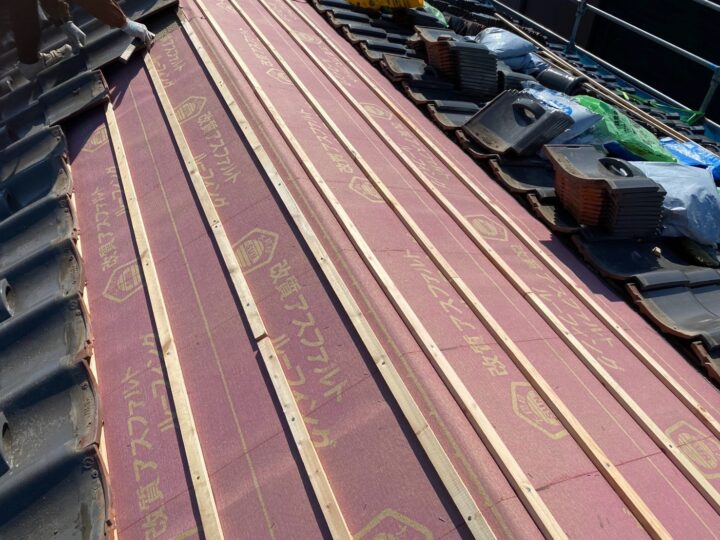 雨漏りを防ぐための重要な役割を担う防水シートを、隙間なく丁寧に貼り付けます。瓦積み直し①